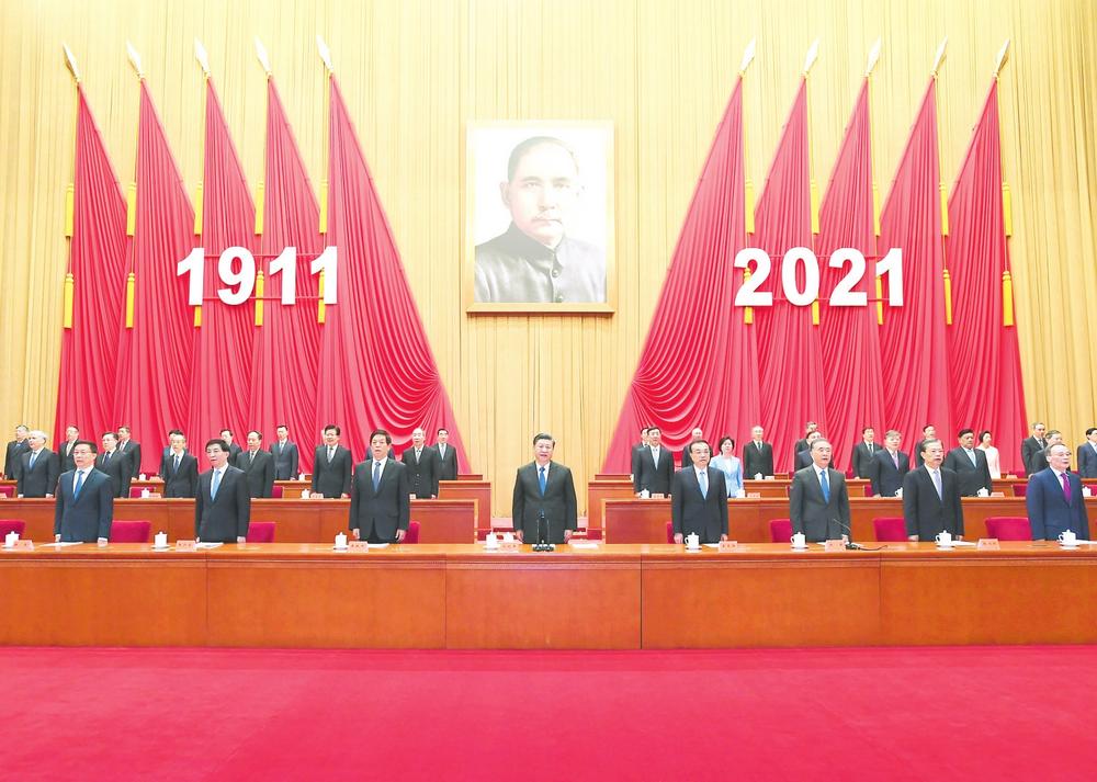 人民大會堂大禮堂氣氛莊重熱烈。主席臺上方懸掛著“紀念辛亥革命110周年大會”會標,后幕正中是孫中山先生畫像,10面紅旗分列兩側,上面懸掛的“1911”“2021”字標格外醒目。