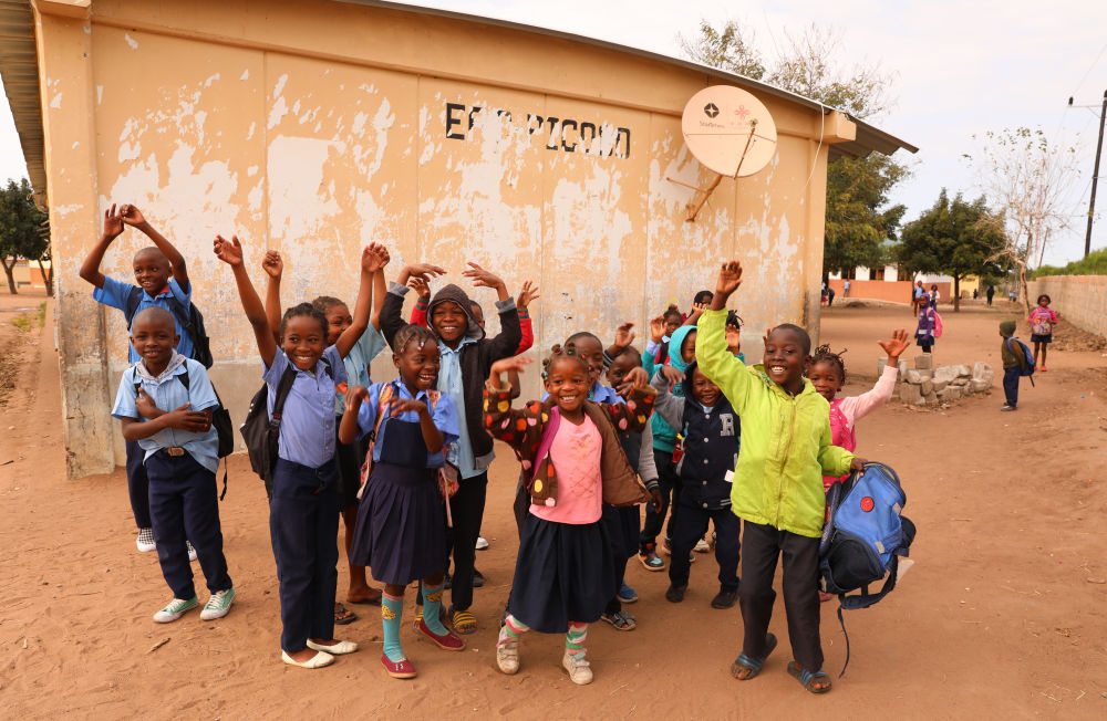 2023年7月25日,莫桑比克馬普托省皮科科村學校的孩子們站在裝有中國援助的衛星電視接收天線的房屋前。“萬村通”項目旨在為非洲國家的1萬個村莊接入衛星數字電視信號,項目2018年在莫桑比克啟動,為該國1000個村落、2萬戶家庭和3000個公共場所安裝衛星電視設備,提供電視信號和節目,覆蓋農村人口達250萬。新華社記者 董江輝 攝